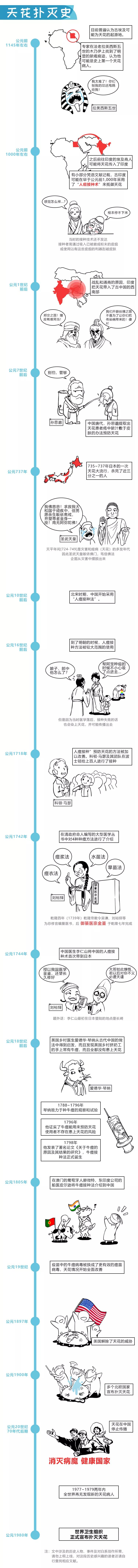 人类征服天花的历程中,中国人较广使用的人痘接种法和英国琴纳发明的牛痘接种法,都为消灭天花发挥了作用。到最后在前人研究基础上发现的疫苗,让人类在与传染病的抗争中取得了最大的胜利!